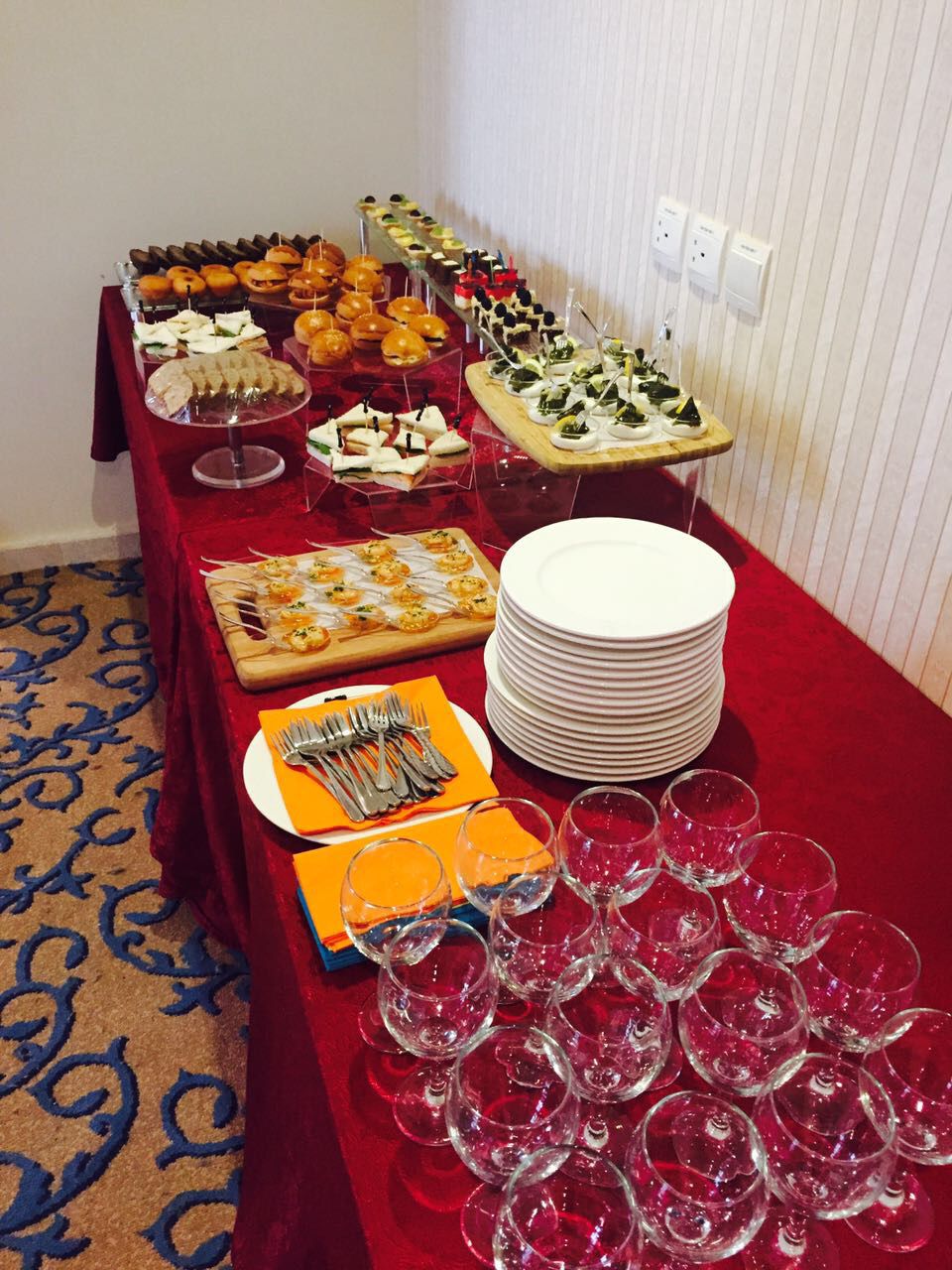 A fully-equipped meeting room (projector-screen-pens-notebook-internet-flip chart-microphone-headphones-water) There are more than one shape for tables and chairs (round table - U table - row table) and chairs individually