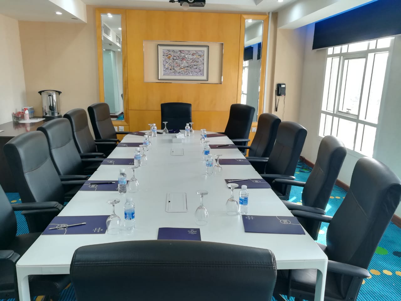 Full-service meeting room (projector-screen-pens-notebook-internet-flip-chart-microphone-headphones-water) There are more than one shape for tables and chairs (circular table-table with U-table in rows) and single chairs