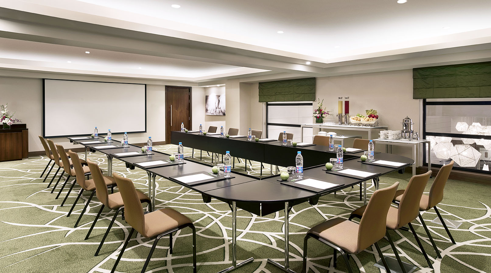 Al Nakheel Meeting Hall is equipped with full service (Projector-Screen-Pens-Notebook-Internet-Flip Chart-Microphone-Headphones-Water) There are more than one shape for tables and chairs (round table-table with U-table in rows) and single chairs
